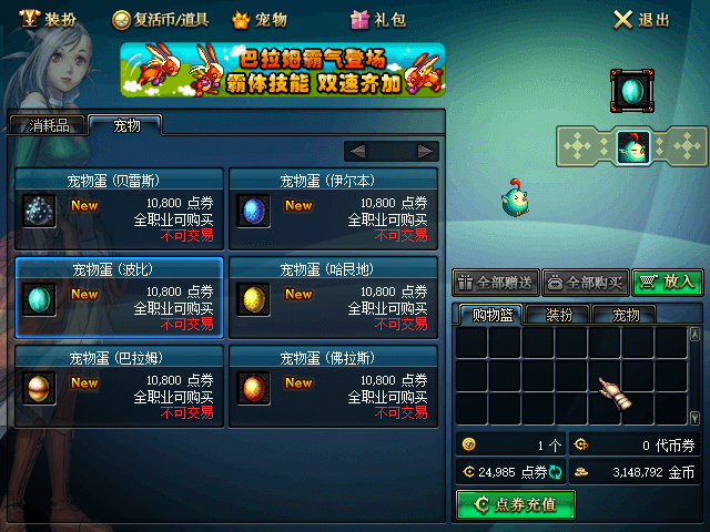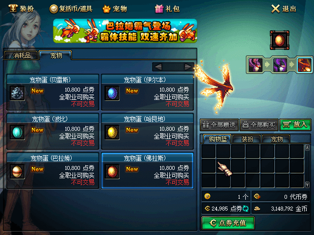 商城内容和细节介绍,包含DNF60版本的原版宠物。
